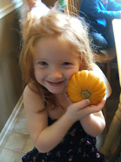 We planted the seeds the the late spring (only 6 seeds total--2 small hills got 3 seeds), and watched the pumpkins develop from tiny green bulbs to perfect little orange cuties, just like we did last summer. It is an excitement that never gets old.