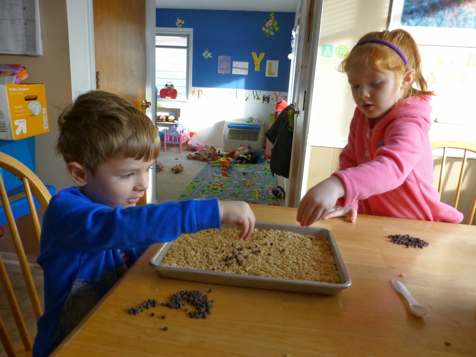 In a large bowl, stir oats and rice cereal together. Set aside. In a small pot, melt butter, honey and brown sugar together over medium high heat until it comes to a bubble. Reduce the heat and cook 2 minutes. Pour in vanilla and stir. Pour over dry ingredients and mix well to moisten all ingredients. Pour into lightly greased small jelly roll pan {about 12x8x1} and press out to be about 3/4 inch in thickness. {If your pan isn't small enough, pack the mixture into one side. You really want to press them down so they stick together.} Sprinkle with mini chocolate chips and press down lightly. Cool on a countertop to room temperature for two hours or until the chocolate chips are set before cutting into bars. Wrap in parchment or plastic wrap and store at room temperature.