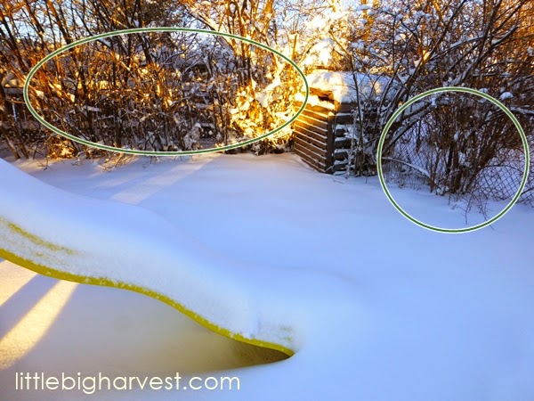 We had potato towers and we grew in straw bales along the fence to the right (south)...the evidence is nearly erased by the snow!