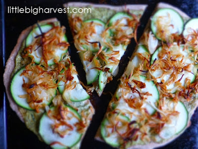I found this recipe in Lady's Home Journal several years ago, and adapted it to my own taste (namely, using Greek yogurt instead of ricotta, since I always have yogurt on hand. Click here to see how I make Greek yogurt--it's easy and tastes infinitely better than any commercial brand). The caramelized onions are really what make the pizza over-the-top delicious (fellow onion lovers, you know how awesome caramelized onion is on anything), and the zucchini takes a sort of co-star role. Together, and added to the pesto base, this simple pizza has become one of my all-time favorites.